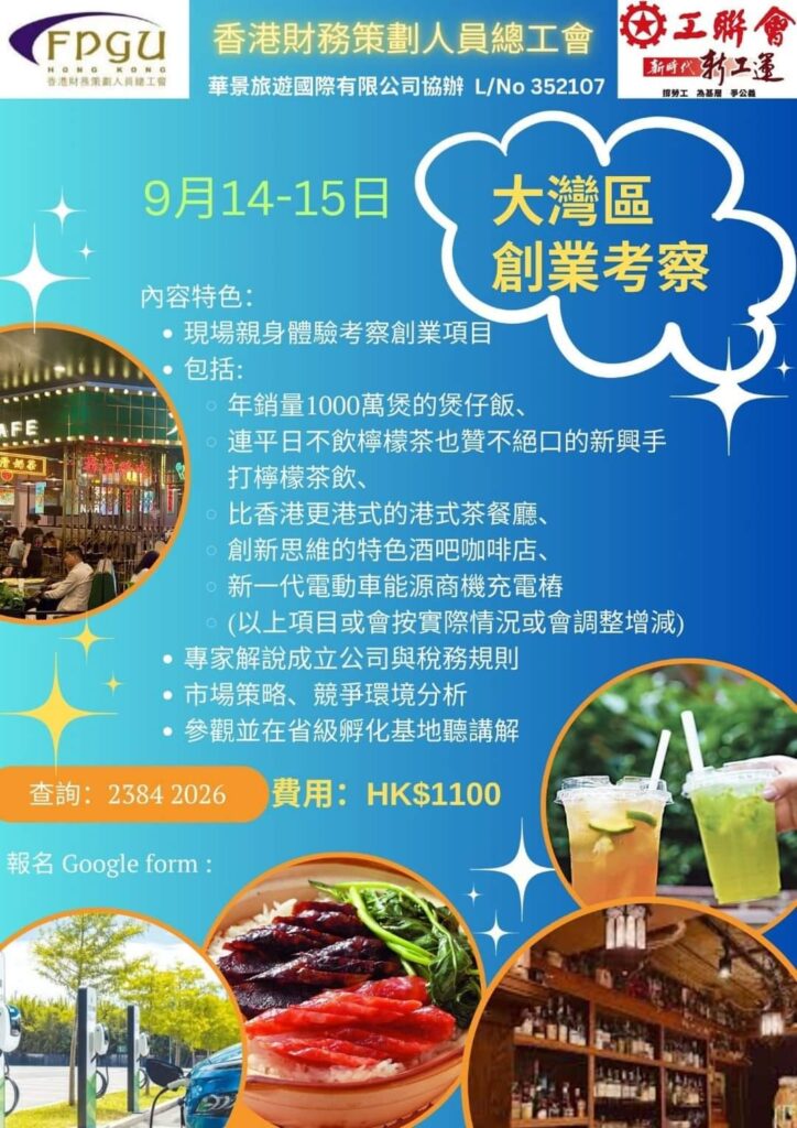 香港財務策劃人員總工會(財策工會)將舉辦一連兩天的大灣區創業考察活動,為會員大眾提供深入了解大灣區創業環境的機會,從而抓緊國家發展洪潮,歡迎大家踴躍參與,共同探索大灣區的無限機遇。活動詳情如下:
